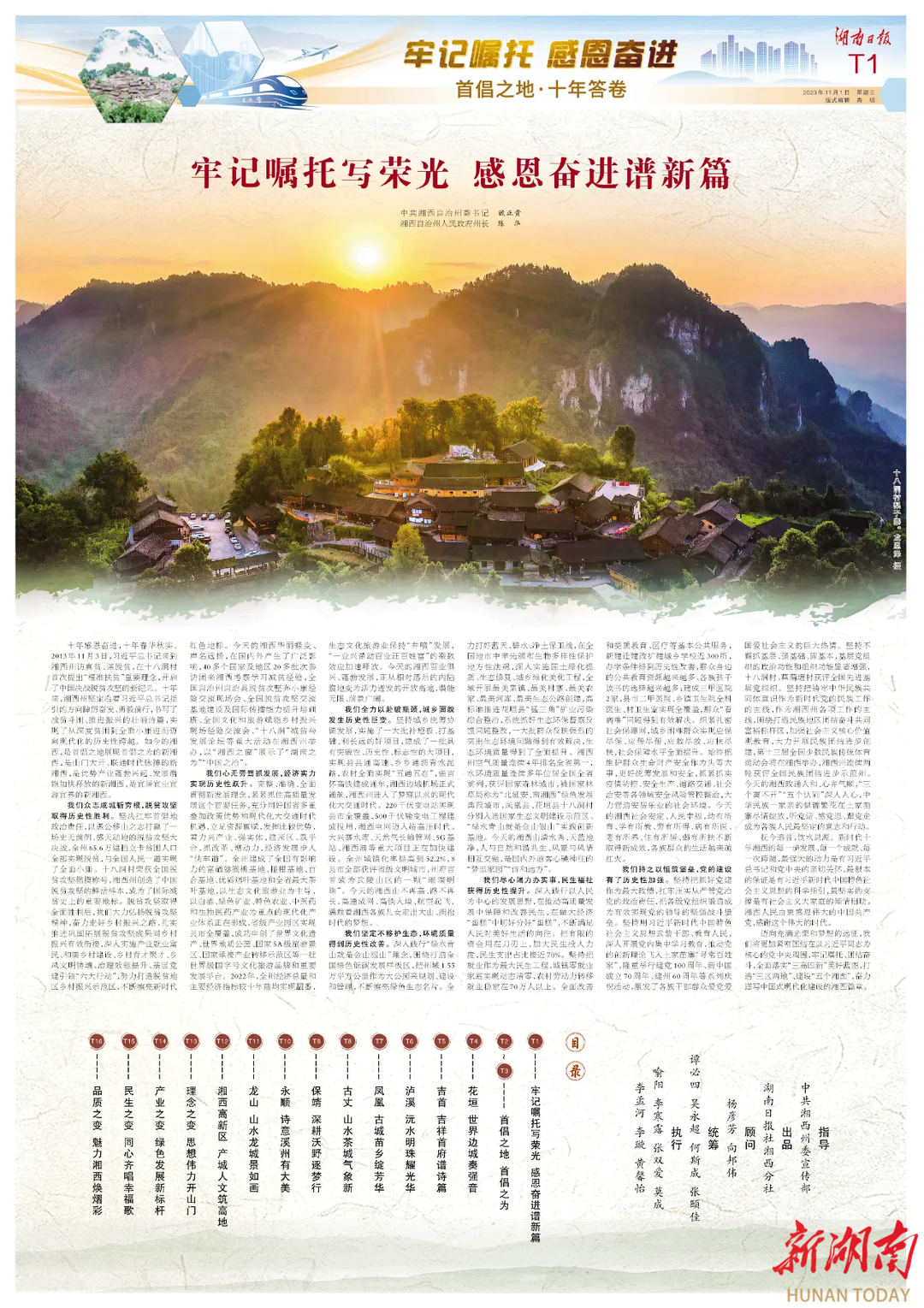 十年感恩奋进,十年春华秋实。2013年11月3日,习近平总书记来到湘西州访真贫、谋脱贫,在十八洞村首次提出“精准扶贫”重要理念,开启了中国决战脱贫攻坚的新纪元。十年来,湘西州坚定沿着习近平总书记指引的方向踔厉奋发、勇毅前行,书写了战贫斗困、推进振兴的壮丽诗篇,实现了从深度贫困到全面小康进而迈向现代化的历史性跨越。如今的湘西,是首倡之地展现首倡之为的新湘西,是山门大开、联通时代脉搏的新湘西,是优势产业蓬勃兴起、发展潜能加快释放的新湘西,是宜居宜业宜游宜养的新湘西。