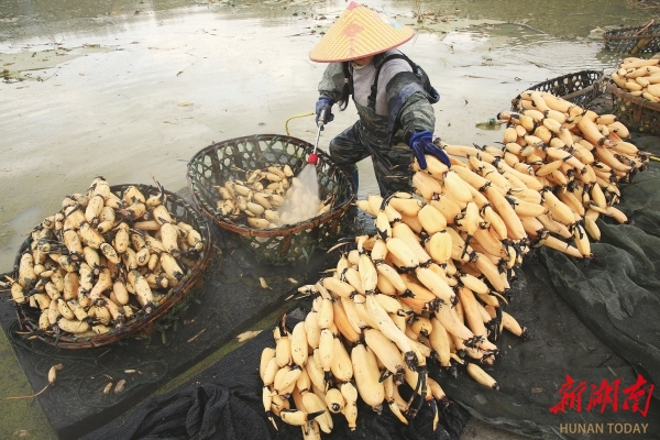 2月15日,龙山县召市镇岩门口村,村民在清洗采挖的莲藕,供应市场。近年来,当地农民通过发展莲藕种植,在家门口实现增收致富。田礼成 摄(湖南图片库)
