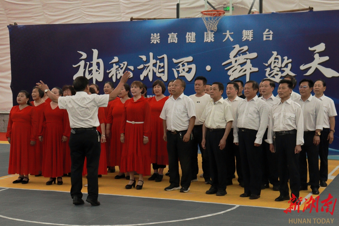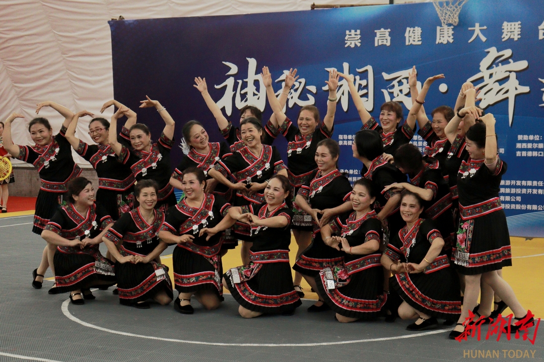 以巍峨的矮寨大桥为天幕,以德夯大峡谷的飞瀑流泉为声效,一场打破舞台边界的非遗焕新盛宴在此上演。活动紧扣“舞邀天下”主题,将苗族银饰锻造、土家织锦技艺等非遗基因编码进广场舞律动——开幕式上,《湘西美》的舞者以摆手舞步伐踏出梯田云海的韵律,《土家情歌》用柔韧的肢体语言演绎西兰卡普的纹样密码,而《和谐中国》则借苗鼓方阵的雷霆之音,将现代广场舞的欢腾与传统祭祀舞的庄严熔于一炉。当《二十四时舞》的“节气密码”被演绎为广场舞动作语言,非遗不再是橱窗里的展品,这一刻,湘西的山水与人文在舞步中完成了跨越千年的共频。