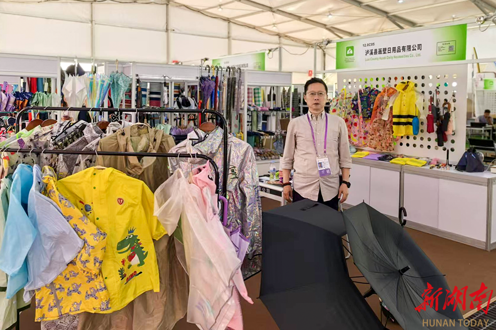 新湖南客户端11月4日讯(通讯员 肖瑞雪)10月15日至11月4日,第138届中国进出口商品交易会(广交会)在广州举办。作为“中国外贸晴雨表”,本届展会吸引全球219个国家和地区超22万家境外采购商、3.2万余家企业参与。湘西土家族苗族自治州泸溪县泸溪画壁(雨具)与华美兴泰(户外储能)两家企业携核心优势参展,前者以政企协同实现县域品牌出海,后者凭技术抢占储能市场,为“湘造”出海赋能。