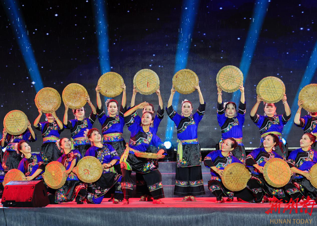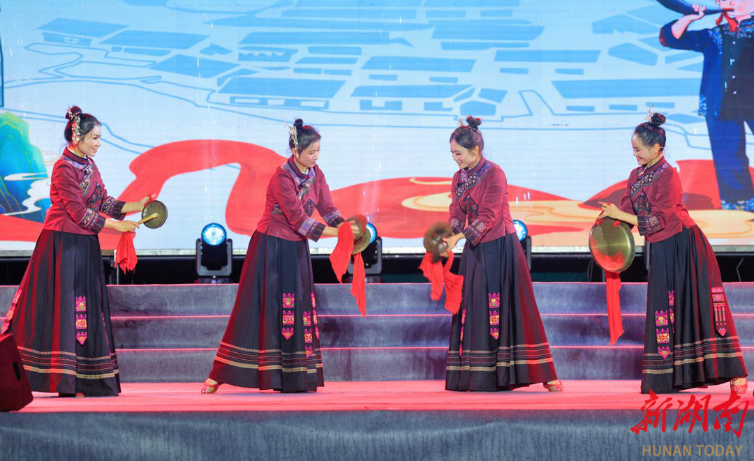 随后,一系列极具湘西地方特色的节目接连登场,精彩纷呈。原生态苗歌演唱声清越悠扬,唱出了苗乡日新月异的变迁和对党的深厚感恩之情;土家族打溜子热烈欢快,锣、钹等打击乐器默契配合,展现了民间传统艺术的智慧与璀璨魅力;苗族服饰展演华美夺目,银饰叮当、绣花绚丽,一针一线都诉说着民族文化的传承、骄傲与生生不息。