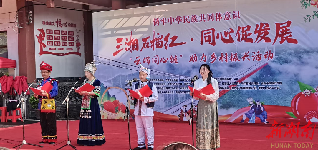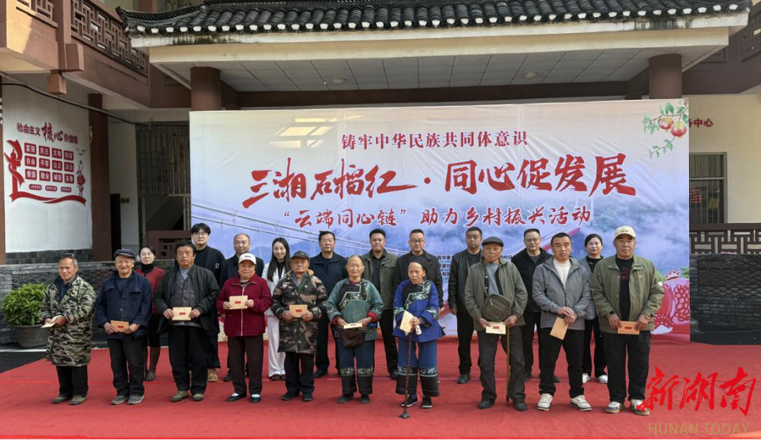 新湖南客户端11月5日讯(通讯员 俞晖)11月4日,“三湘石榴红,同心促发展”暨“云端同心链”助力乡村振兴活动,在湘西土家族苗族自治州吉首市矮寨镇坪年村举行。活动由吉首市委统战部牵头,联合多家单位、爱心企业与社会组织,以捐赠帮扶、文艺汇演、义诊服务、技能培训等多元形式,着力推动民族团结与乡村振兴深度融合,践行铸牢中华民族共同体意识的时代使命。