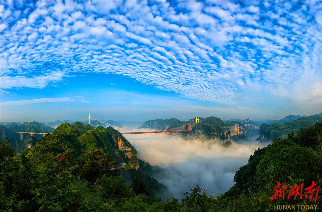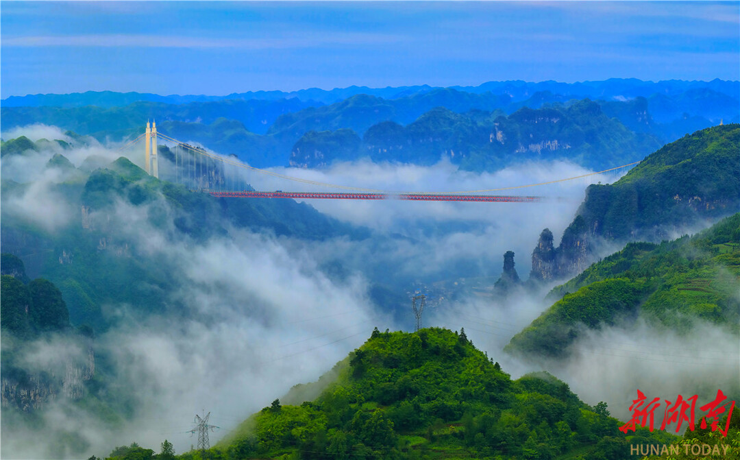 傍晚时分,夕阳西下,金色的余晖洒在矮寨大桥的钢索上,将大桥染成了一幅金色的画卷。谷底的德夯苗寨升起袅袅炊烟,苗家姑娘的歌声顺着风飘向大桥,与桥上汽车的鸣笛声交织在一起,形成了一首独特的“古今交响曲”。这一刻,让人深刻感受到湘西的“新”从未告别“古”,而是让现代与传统在此共生共荣,共同书写着湘西新的历史篇章。