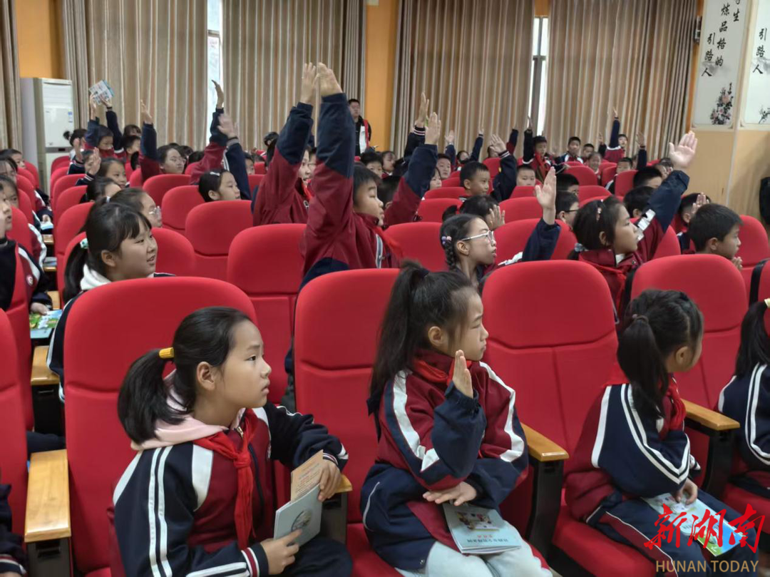 将“案子”变成“段子”,在多媒体教室主会场,湘西州强戒所工作人员结合真实案例,通过观看视频和场景化演绎用小学生听得懂、愿意听的方式深入揭露传统毒品及新型毒品的伪装陷阱,深刻阐释毒品对个人健康、家庭幸福和社会稳定的严重危害,引导学生牢固树立“珍爱生命、远离毒品”的意识。针对未成年教育,工作人员解读《未成年人保护法》中家庭、学校、社会、司法“四大保护”核心条款,细致传授防范校园欺凌、网络侵害的实用技巧,让法律知识入耳入心。随后开展的“平安知识大闯关”互动环节,将现场气氛推向高潮。围绕防邪、禁毒、安全生产等主题设计的抢答题目,激发了同学们的参与热情,大家踊跃举手、积极作答,在紧张有趣的互动中巩固了法治安全知识,答题正确的同学还收获了警察熊、文具等精美礼品,现场氛围热烈而有序。