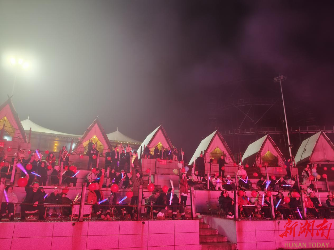 夜幕降临,篝火晚会如期而至。在金婚夫妇的共同点火仪式中,熊熊火焰照亮夜空,也点燃了现场的热烈氛围。金婚夫妇分享数十年相濡以沫的爱情箴言,字字句句饱含岁月沉淀的智慧与温暖;新人与嘉宾接连献上才艺表演,歌声、笑声交织回荡;有奖问答与默契大比拼环节趣味十足,10对夫妇踊跃参与,在互动中增进默契,现场掌声不断。最后,在喜娘的带领下,众人围绕篝火跳起土家摆手舞,欢快的舞步踏出幸福节拍,将晚会气氛推向高潮。