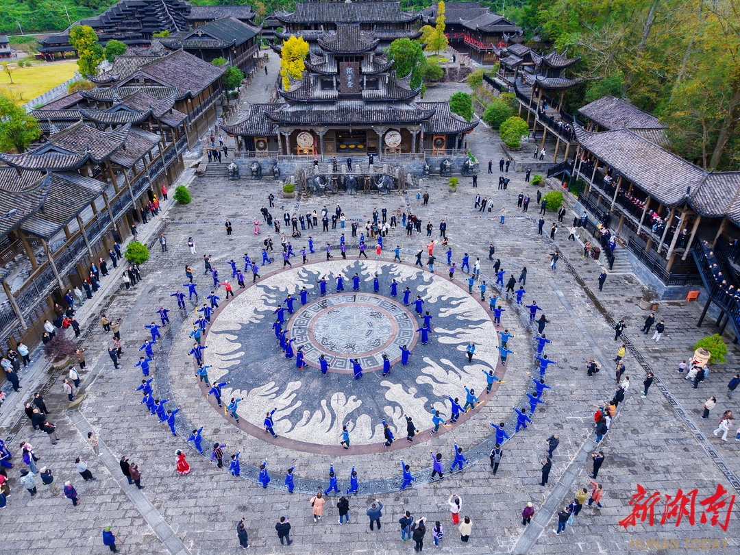 在惹巴拉摆手堂,上百名游客与当地村民携手围成一个大圆圈,随着鼓点欢快起舞。土家儿女们在全身各部位肌肉的协调配合下,通过扭、转、屈、蹲等动作组合,生动再现着挖土、撒种、薅草等农耕场景。