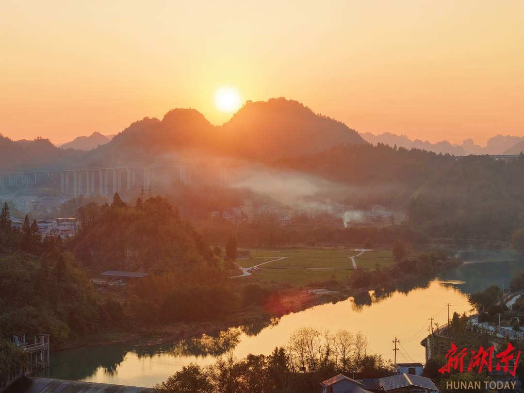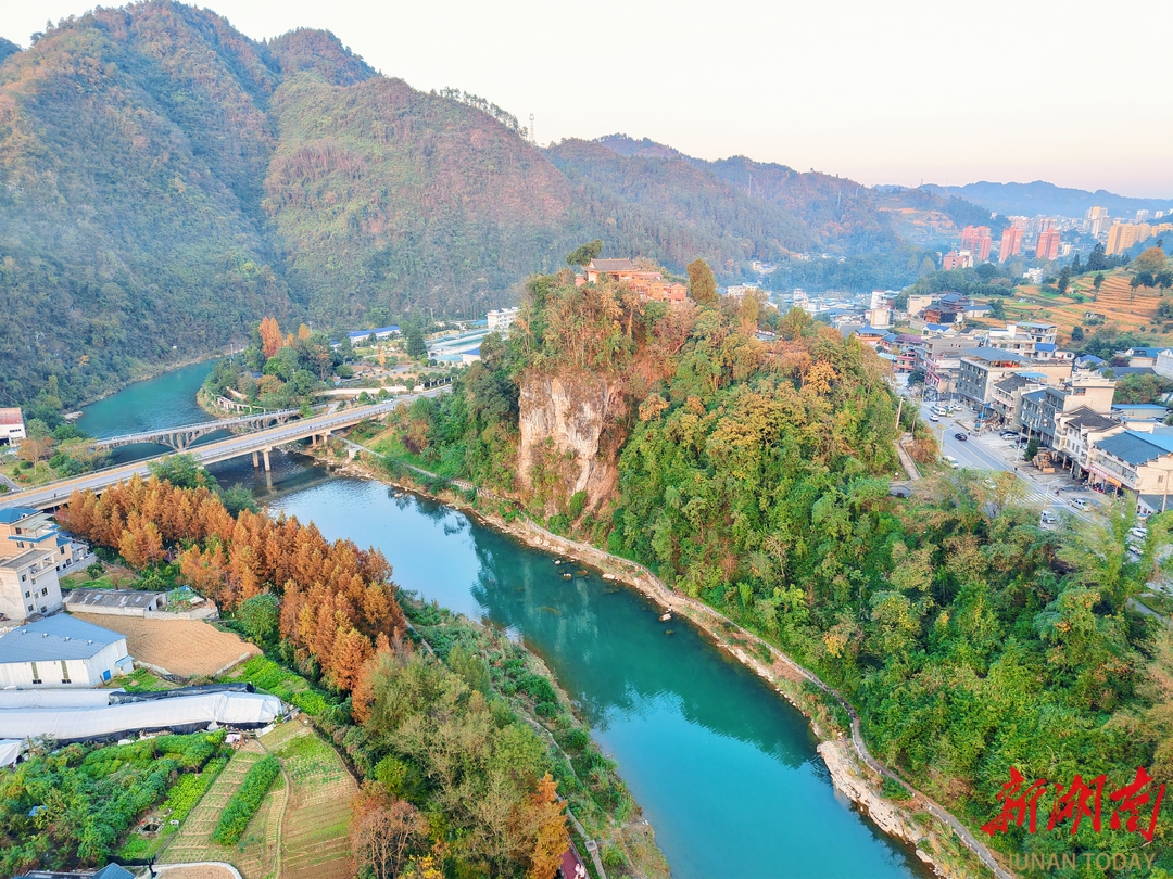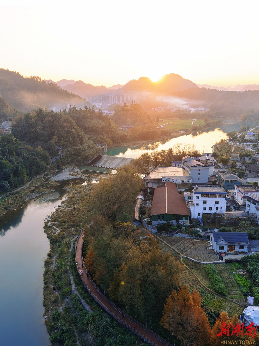 11月16日,天朗气清,在湘西土家族苗族自治州吉首市狮子庵大桥畔,雾霭缭绕,水杉林与峒河、远处人家交相辉映,风景美如画。