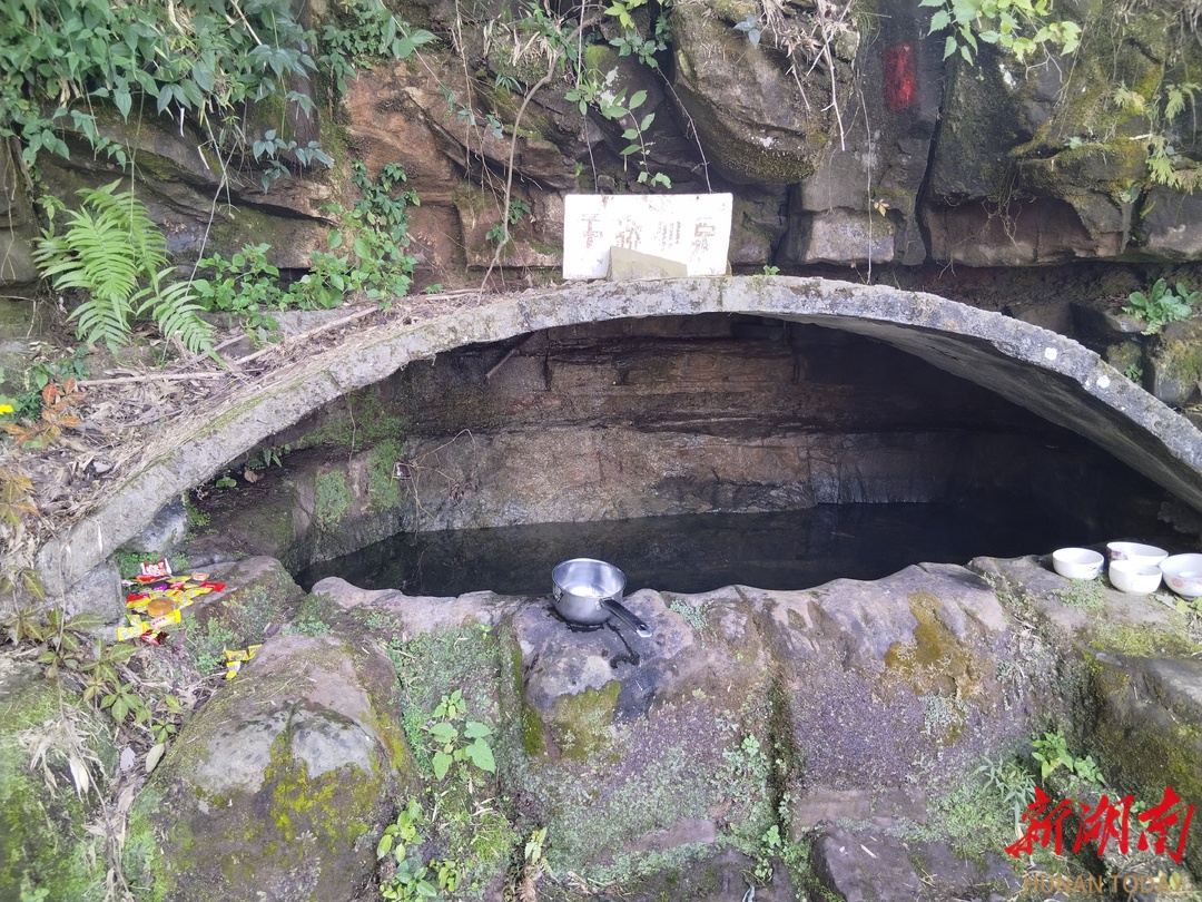 行至天桥仙泉处,大家都有点步履沉重,呼吸急促,额头上渗出了密密麻麻的汗珠子。周显富提议大家休憩一下,恢复体力再出发。于是,大家各自找了石板坐下。趁此机会,瓶中矿泉水喝干的人,忙着去旁边的“天桥仙泉”取水。天桥仙泉的泉水都是从石缝中渗透出来的,甘甜清冽,有益健康,故在当地有“神水”之称。