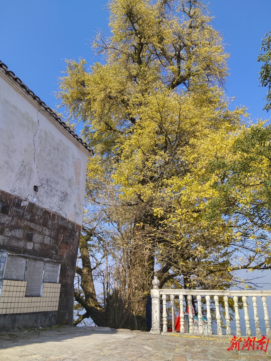 当我们陆陆续续到达天桥山顶的千年老银杏树下时,已是11时50分。皇天不负有心人,映入眼帘的一幕让大家惊喜不已——只见那棵近三十米高、有着2600余年树龄的古银杏,正金光灿烂地矗立在古刹边。它苍劲挺拔,满树金黄,随风摇曳。只有极少的银杏叶,眷恋大地的怀抱,在我们到来之前悄然飘落。