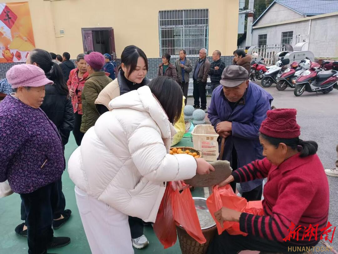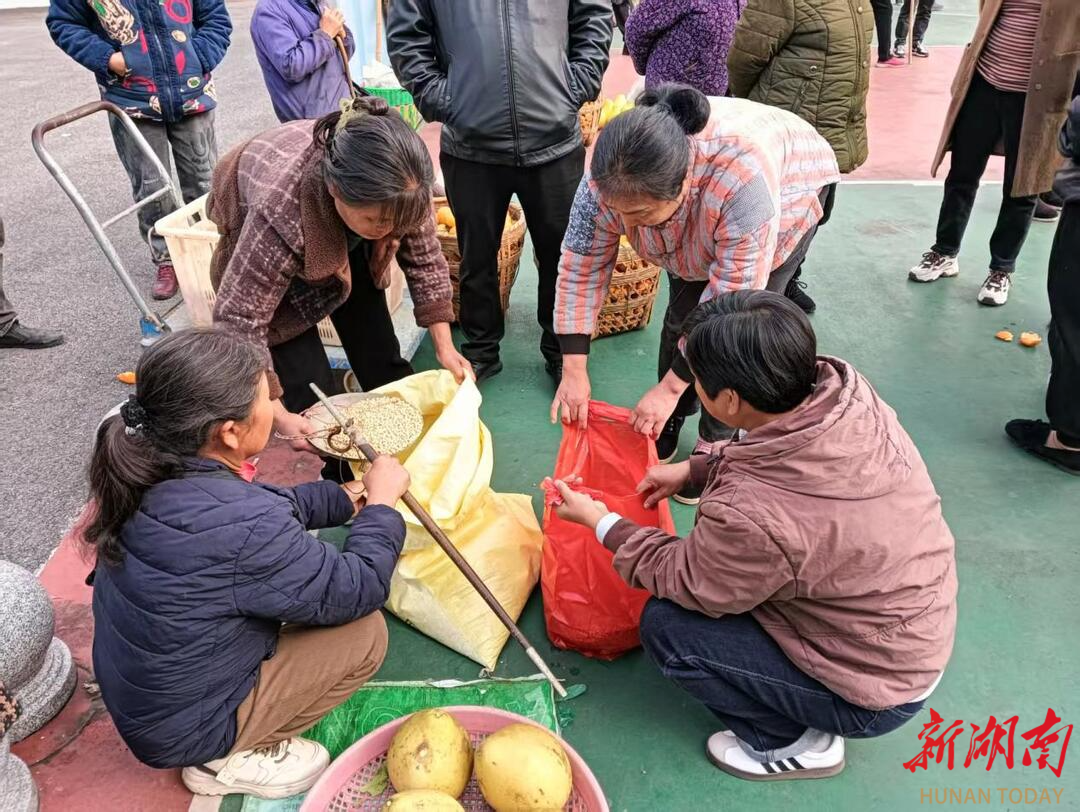 上午8时,“纳福集市”上早已人声鼎沸。柳树坪村、押马村、拔茅村等周边村落的村民按照划分区域,已将自家种养的新鲜农副产品和家禽整齐摆放:家禽区,土鸡、土鸭活蹦乱跳;土特产区,山茶油、菜籽油晶莹透亮,本地黄牛肉、山羊肉肉质鲜嫩,熟食喂养的猪肉、自家熏制的腊肉品相诱人;水果区,刚采摘的沙田柚、砂糖柑和南风蜜桔色泽鲜艳;小吃区,油粑粑、米豆腐和醋萝卜等地道风味引人注目……整个集市充满了浓郁的乡土气息。