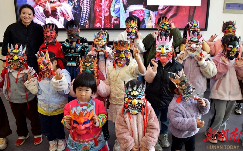 近日在湘西州博物馆(非遗馆),孩童展示绘制的傩面。(姚方 杨燕萍 摄)