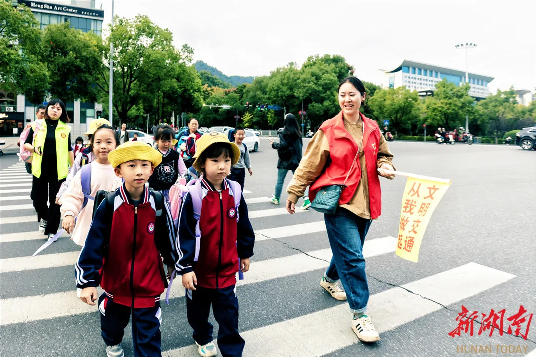 吉首市交警女子护学岗队员护送学生过马路(杨贤清 摄)