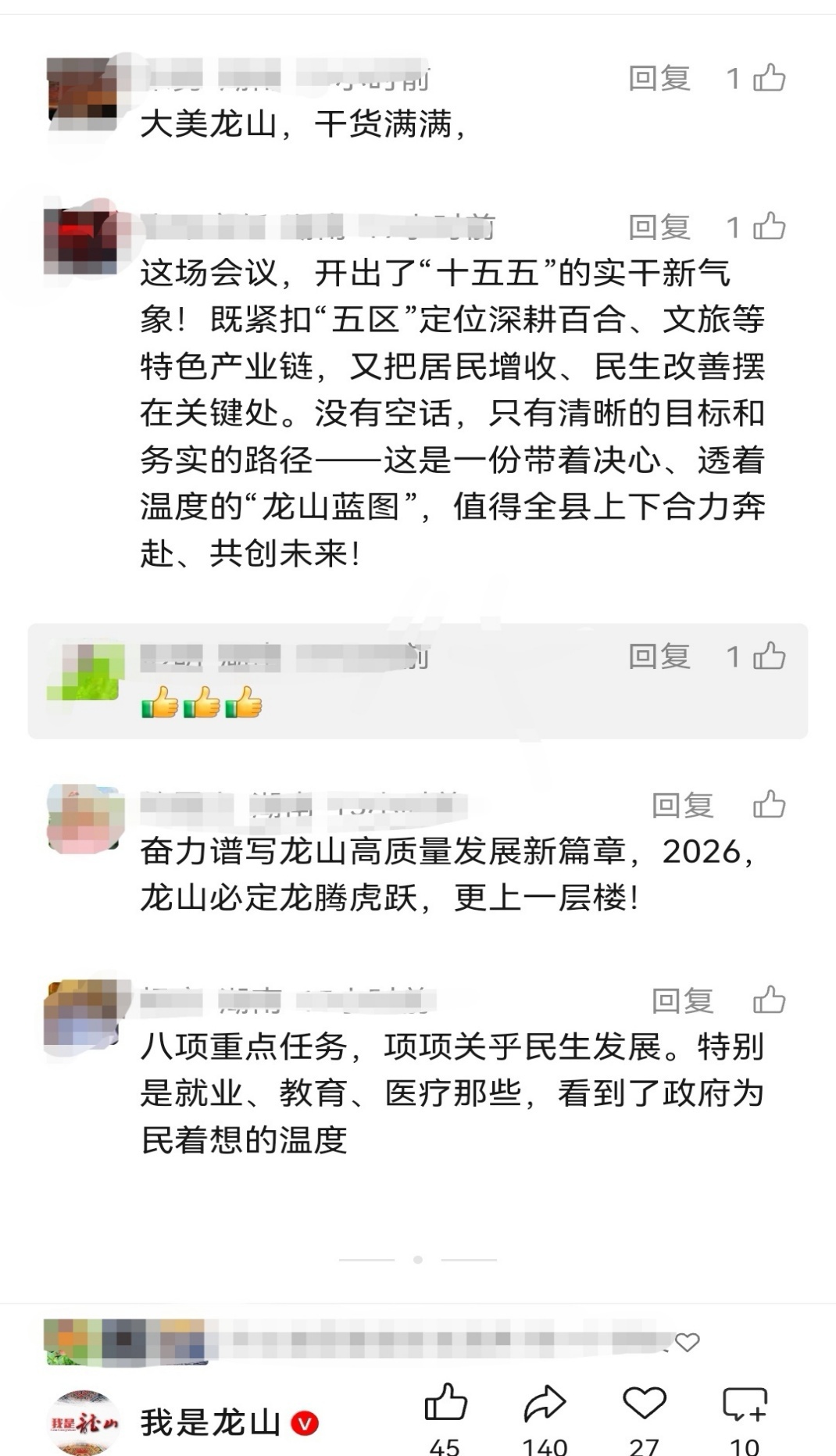 从充满期盼的“希望我们大龙山越来越好”,到信心满满的“2026,龙山必定龙腾虎跃,更上一层楼”,再到表达决心的“任务书、路线图都明确了,接下来就是铆足劲一起干”,各界热议汇聚成对龙山未来发展的一致看好与共同期盼。