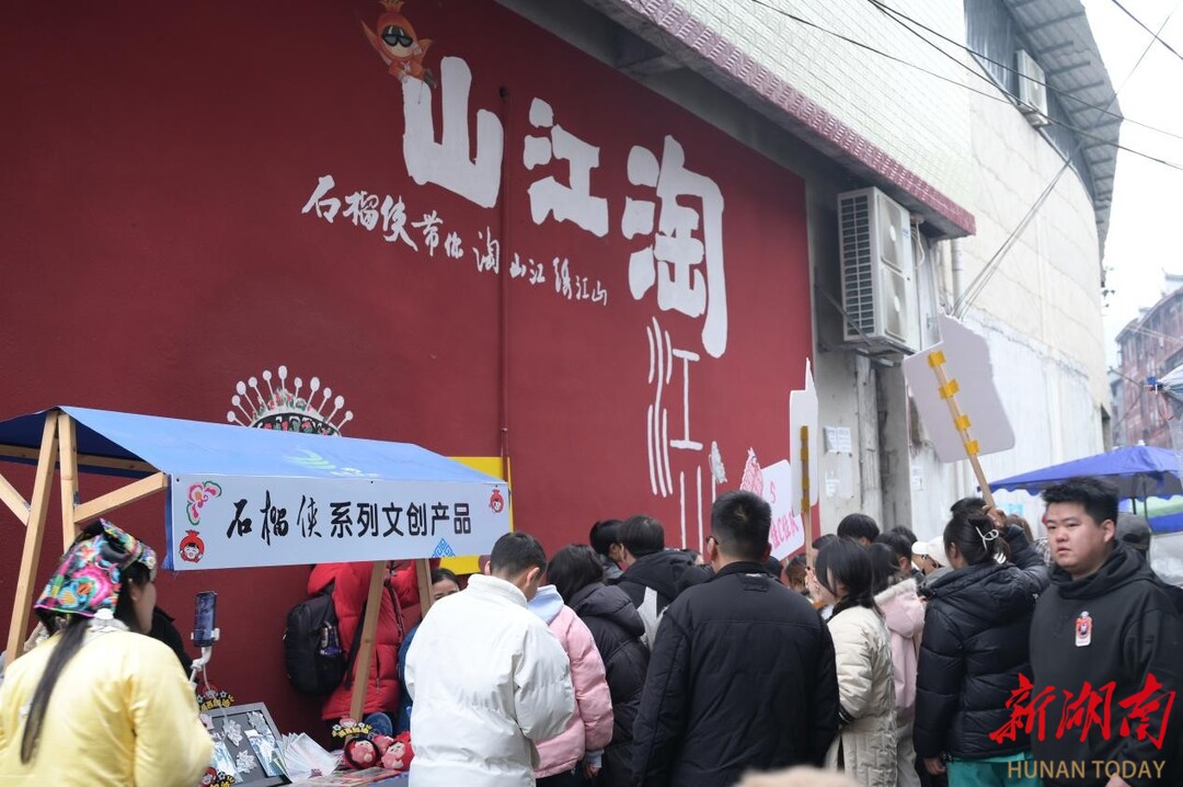 龙芳陪着她们走了一段,才发现镇上多了个非遗集市。苗族服饰、银饰、绣片、蜡染、绣花包,还有“石榴侠”周边文创,整整齐齐地摆着。一面彩绘墙下,年轻人们正精挑细选着非遗文创产品,墙上“山江淘·淘江山”六个大字被雨水洗得格外鲜亮。
