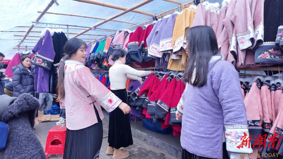 两个年轻姑娘站在阿婆的摊前,拿着衣服比划,眼里是藏不住的喜欢。阿婆说着苗话,她们听不懂,急得直摇头。