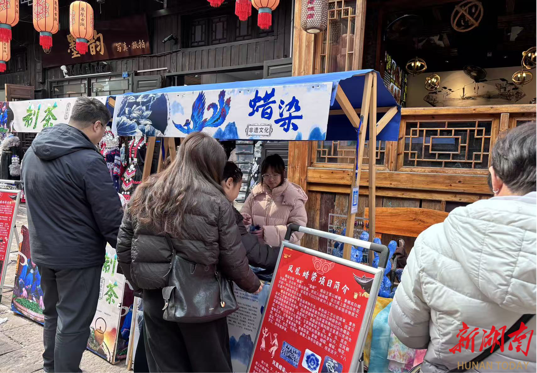 新湖南客户端2月19日讯(通讯员 黄文渊 陈婉娇)春和景明,沱江欢腾。2月17日,湘西土家族苗族自治州凤凰县非物质文化遗产保护中心组织苗族银饰锻制技艺、凤凰蜡染、苗医药——杨氏古法正骨术、苗家古法制茶技艺、凤凰姜糖制作技艺五大非遗项目,在凤凰古城南边街参加“凤舞南边·春满古城——2026凤凰古城南边街新春喜乐汇”活动。数位传承人现场献艺,让市民游客在沉浸式体验中感受中华传统文化的深厚底蕴与独特魅力,一场集视觉、味觉、触觉于一体的非物质文化遗产展示活动热闹拉开启幕。