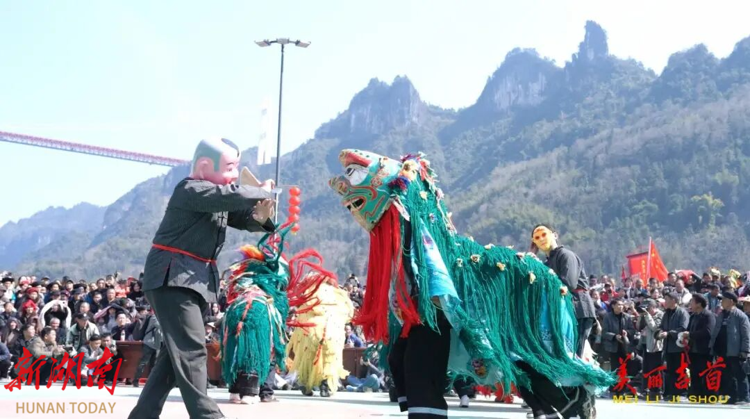 2月20日,湘西土家族苗族自治州吉首市矮寨镇锣鼓喧天、人声鼎沸,一年一度的“湘西苗族百狮会”在这里火热上演!来自湘鄂渝黔四省(市)边区的52支队伍256只狮子跨越山水相聚,齐聚苗乡,以舞会友,狮王争霸,将新春的喜庆氛围推向高潮。
