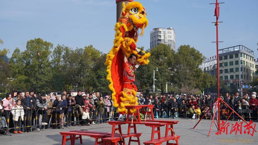 2月20日,农历大年初四,湘西土家族苗族自治州龙山县“神秘湘西过大年·别样龙山闹新春”文化系列活动迎来客流高峰。上午11点,龙凤广场上,两只“雄狮”登场,腾挪跳跃、一字冲天,气势昂扬。整个表演精彩纷呈,大家纷纷拿出手机记录精彩瞬间。新湖南客户端通讯员 莫代银 摄影报道