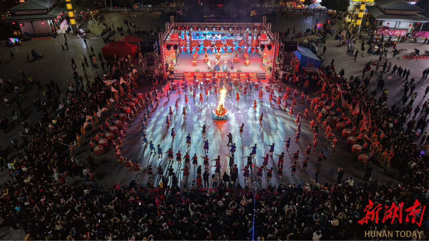 新湖南客户端2月24日讯(通讯员 王秋月 张国东 张前 符露文)2月22日,正月初六,湘西土家族苗族自治州龙山县“千人同欢舞·摆手迎吉祥”篝火晚会火热上演,四面八方的市民与游客手牵手,围着熊熊篝火踏歌而舞,在欢腾的节奏中共庆马年新春。