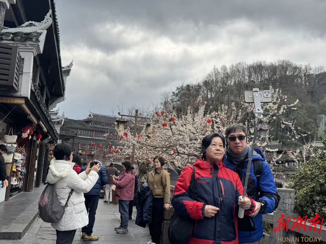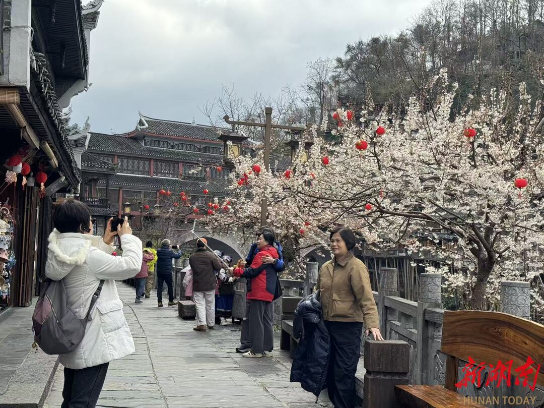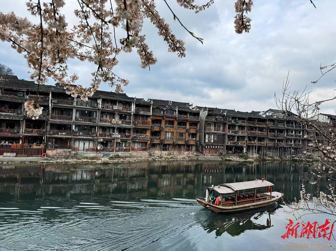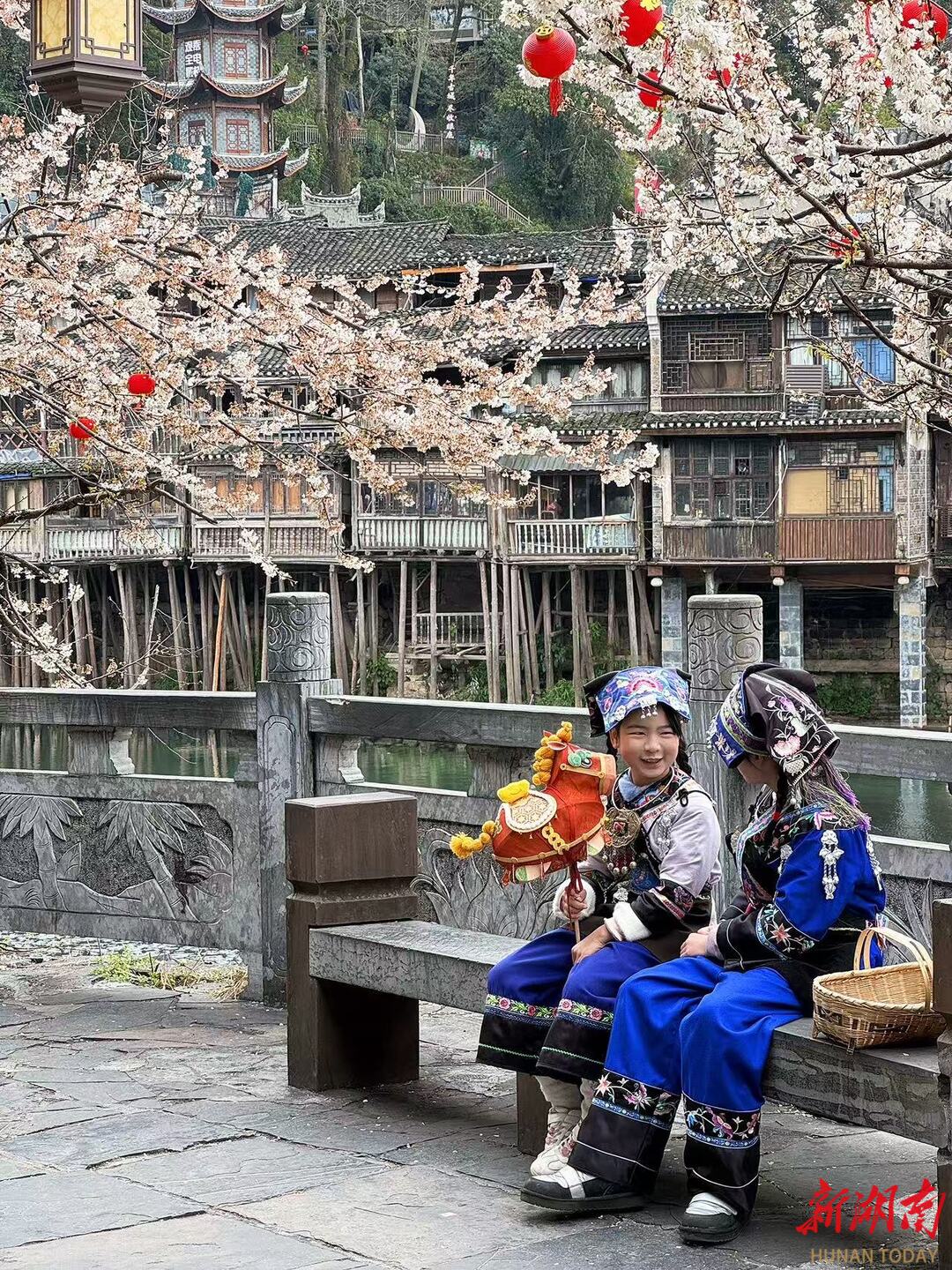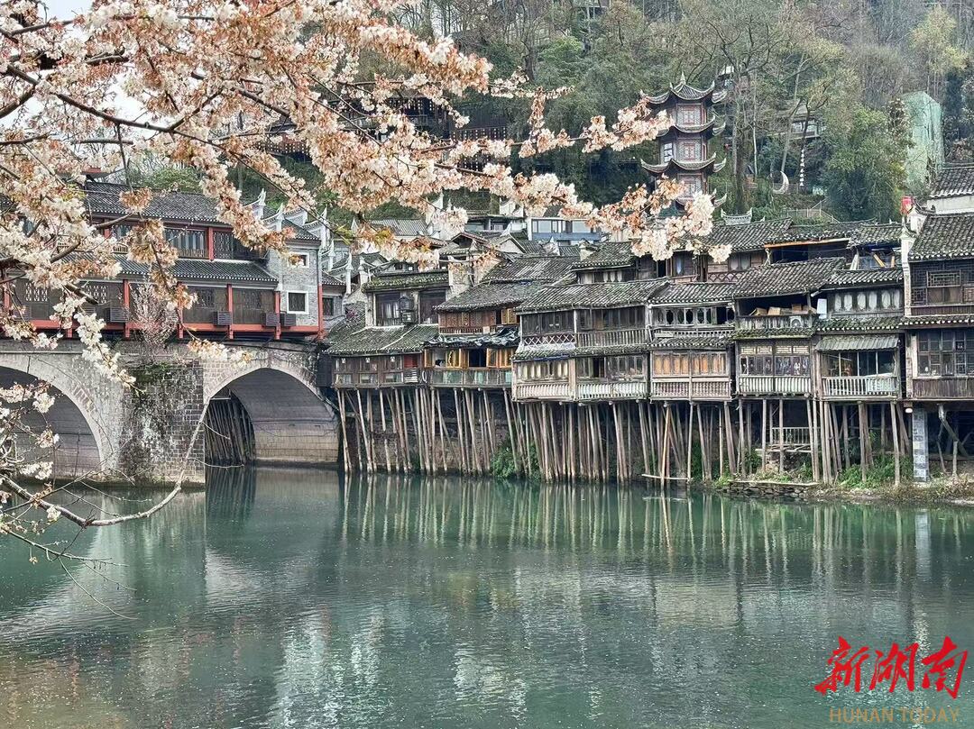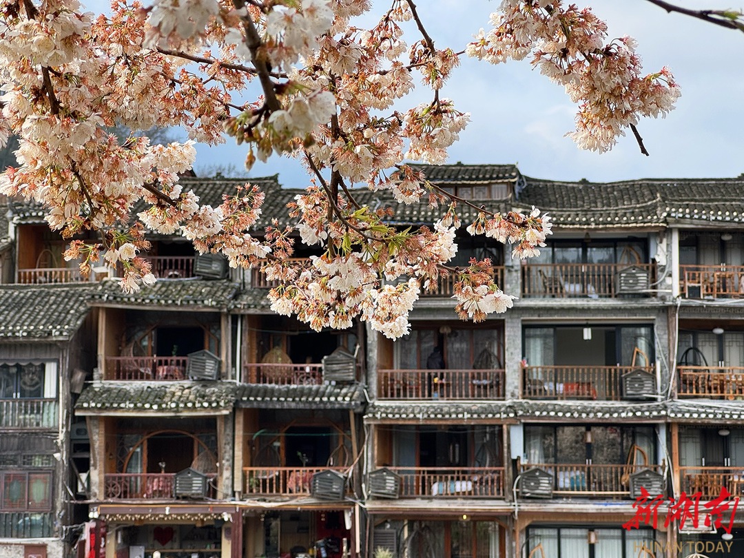 凤凰古城樱花盛放,粉白如云霞轻覆枝头,与青石板、吊脚楼、沱江水相映成画。