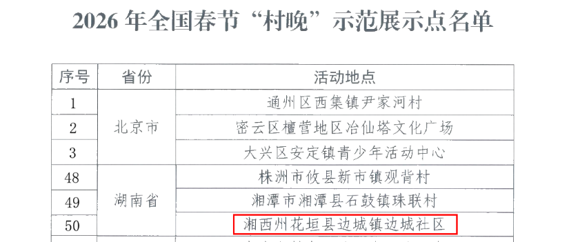 新湖南客户端3月11日讯(通讯员 田彬)近日,文化和旅游部公布2026年全国“四季村晚”主场和示范展示点名单,湘西土家族苗族自治州花垣县边城镇边城社区入选。